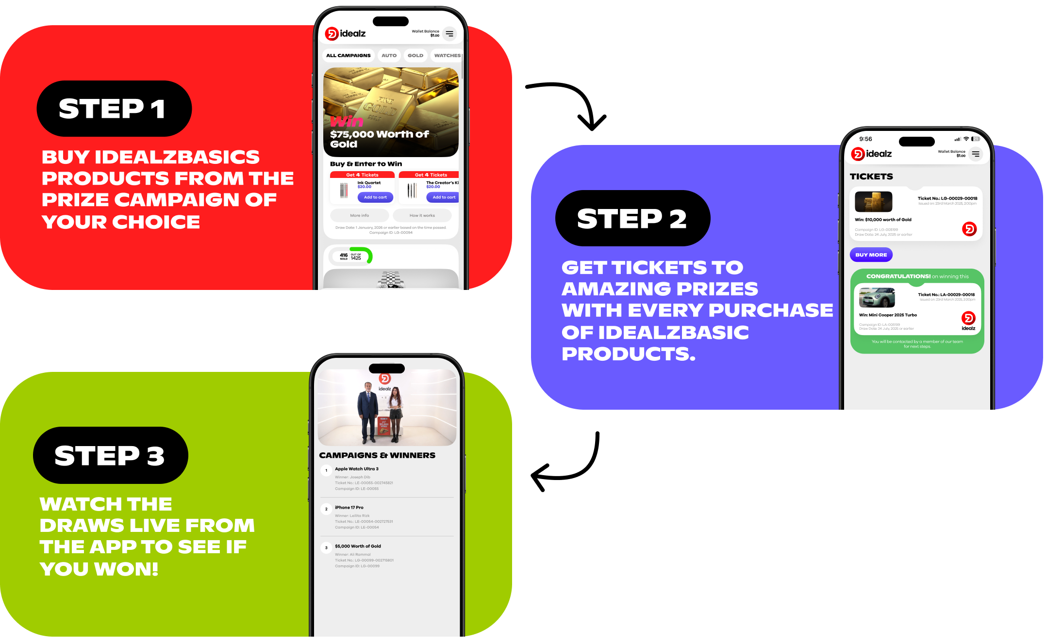 Welcome to Idealz, a 'Shop & Win' platform where shopping turns into something far more exciting. Every purchase from our idealzbasics collection gives you entries into exclusive prize draws for life-changing rewards, from gold and cars to the latest tech, luxury goods and much more!